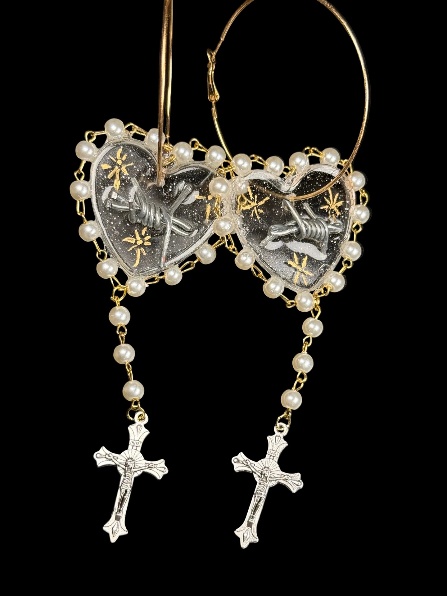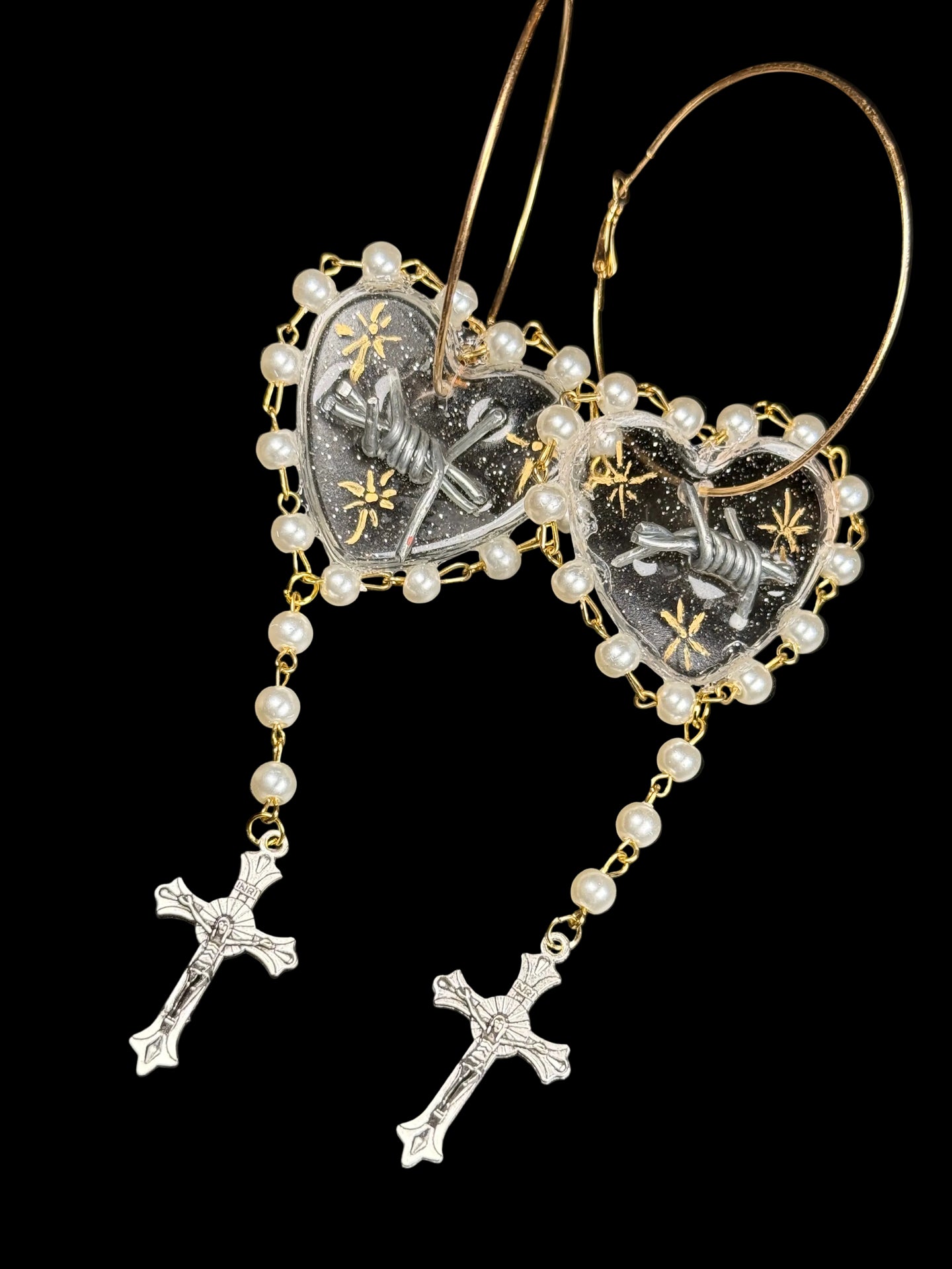 Resin jewelry featuring real barbed wire. (Edges have been sanded down) and hand painted Chicano stars. Rosary pearls.